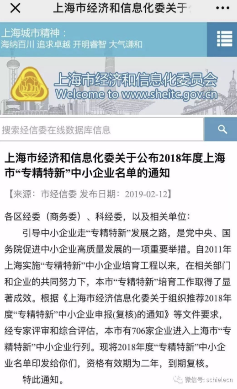 2月12日,上海市經濟和信息化委員在官網宣布《上海市經濟和信息化委對于發布2018年度上海市“專精特新”中小企業名單的告訴》(滬經信企〔2019〕92號),施勒智力科技廠家(天津)股分無窮廠家(也叫“施勒智力”)前三甲此中。